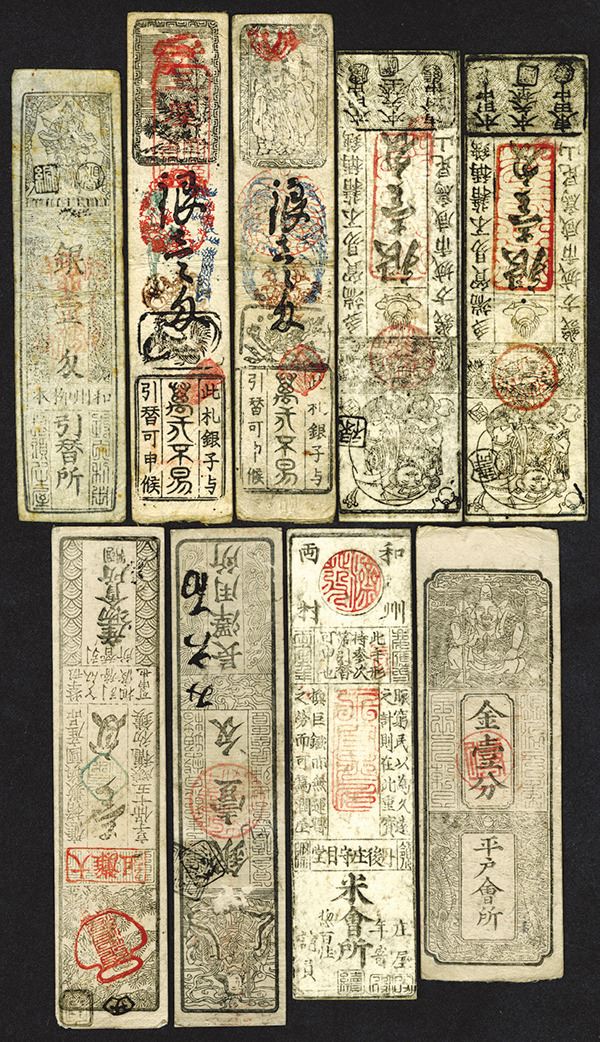 Japan. Group of Han-Satsu. Many two-color with additional hand stamps. Very Fine or better. 9 pieces.