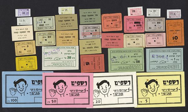 Group of Kibbutz notes. Primarily from kibbutz Ramat- David and Niveh Yad. Most have been cashed in or canceled, have hand written canceled in Hebrew on backs of them. 31 pieces, all in good condition