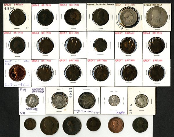 Group of Mostly Early Great Britain Pieces. 1562 Six Pence. Fine details; 1887 Six Pence. AU; 1709 Shilling. About Fine; 1818 Half Crown counter stamped “LI.” VG; 1663 Crown. Good detail, minor edge bruises. Also includes early British copper pieces, and a proof like 1970 Penny. Must be seen. [29], weight approximately 1 lb.