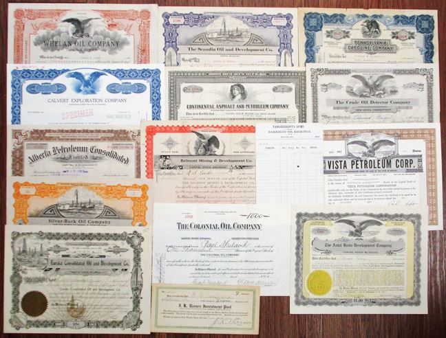 Colorado, Texas, Canada, California, Nevada and South Dakota, Lot includes over 10 pieces, most are oil-related, some mining and development. Highlights include: Colonial Oil Co. 1000 Shares I/U Capital Stock Certificate; Eureka Consolidated Oil and Development Co. 500 Shares I/U Capital Stock Certificate; Alberta Petroleum Consolidated Ltd. 100 Shares I/U Stock Certificate; Calvert Exploration Co. Specimen Stock Certificate; Belmont Mining & Development Co. 200 Shares I/U Capital Stock Certificate; and Axial Basin Development Co. 12 Shares I/U Preferred Capital Stock Certificate. 15 pieces.