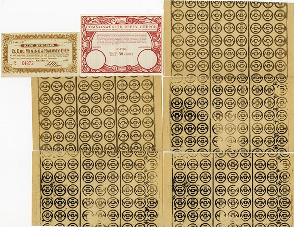 Mexico and Uganda. Commonwealth Reply Coupon for 50 cents and El Oro Mining and Railway Co. card for 1 peso. Both attractive looking notes. Also included is a Korea paper design with coin images (5 pages), there is a total of 7 notes in group.