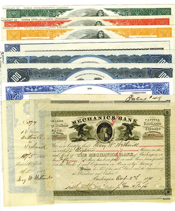 10+ Certificates of banking related stock and bonds including Mechanics Bank, First National Bank of Hoboken, Cool Saving, Inc., and Bankers Trust New York Corp. All are ranging from VF-XF condition.
