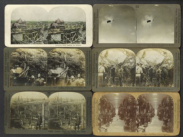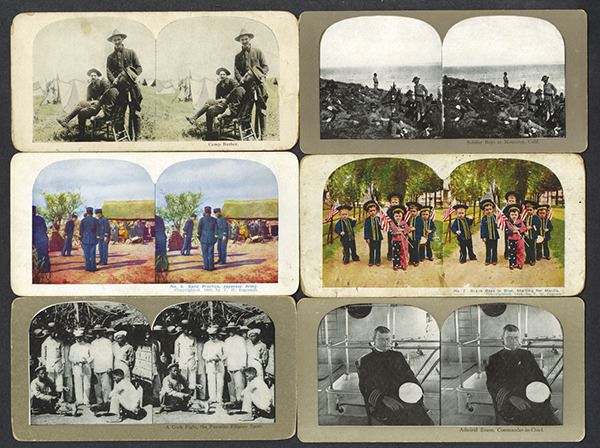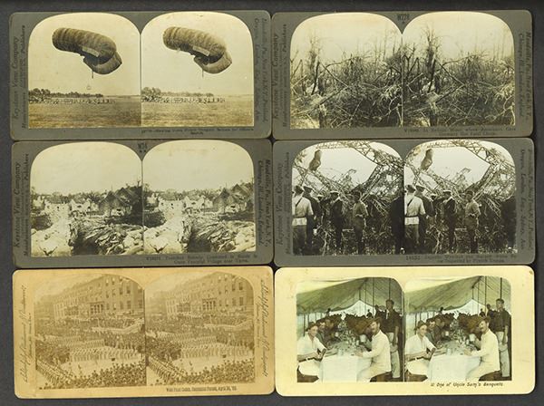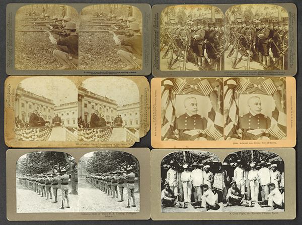 United States. Includes various views of Pacific Navy officers, Dewey, and Philippines. Also WWI era aviation wreck and balloon. Some colorized, others with slight paper loss on the back. Kilburn, Underwood, Keystone companies represented. Some with spotting. 22 pieces.