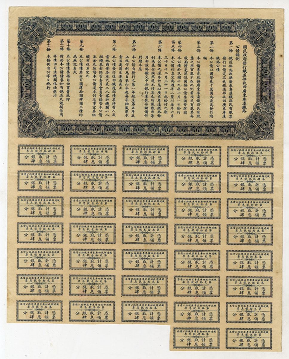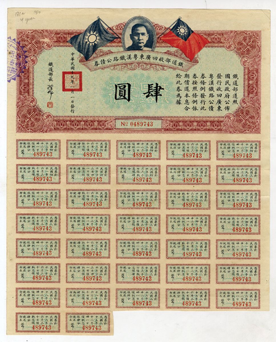 China, 1930.... Issued Railroad Coupon Bond printed in Chinese, Maroon on blue underprint with portrait of SYS at top flanked by flags at either side, S/N 489743, VF to XF condition.