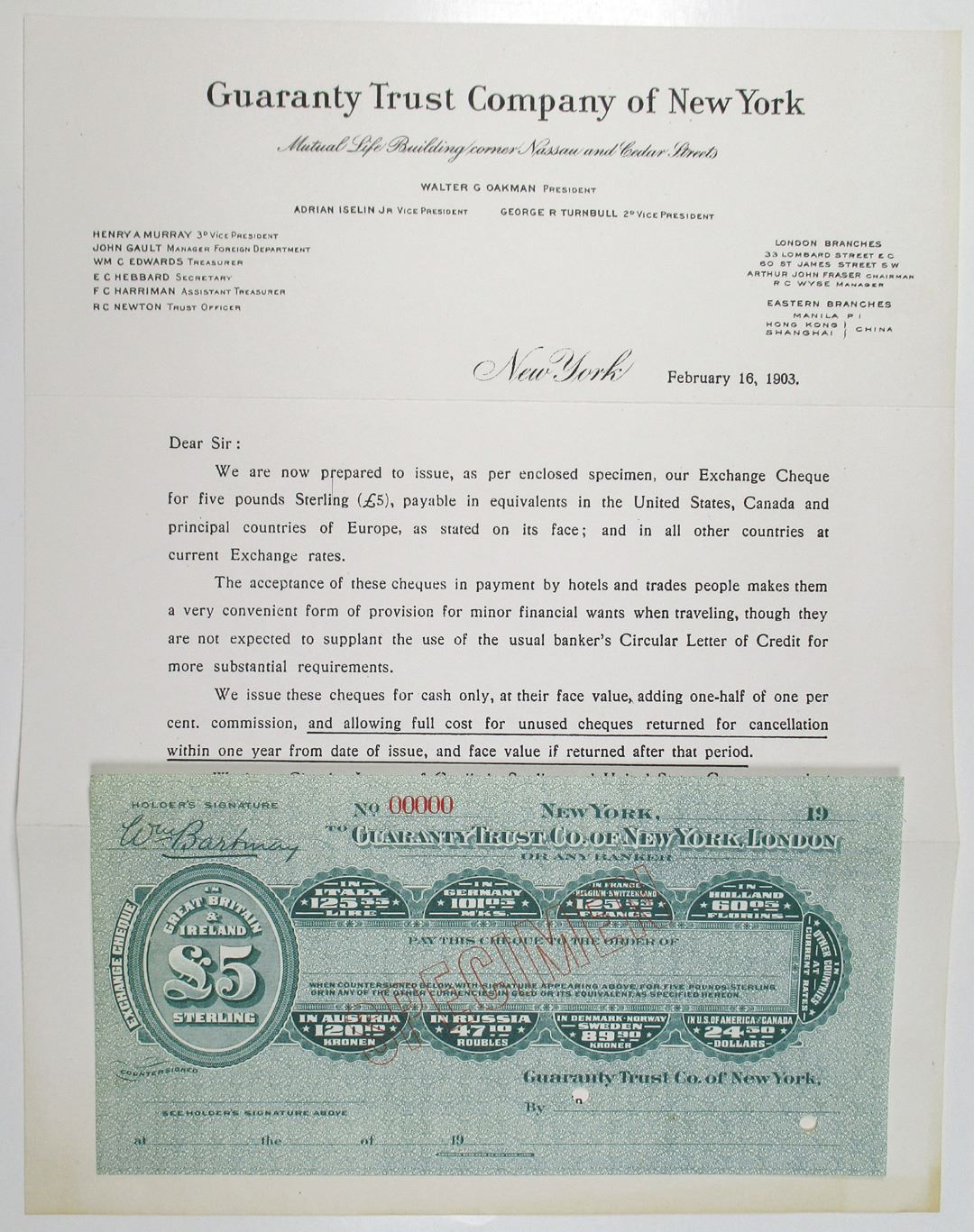 New York, 19xx (1930). Early "Exchange Cheque" Travelers Cheque Specimen, Green text with green background. Denominations in Pounds, Lire, Marks, Francs, and Florins. Red specimen overprint, 00000 serial number, and POCs. AU condition with pin holes on the top right corner. Also includes matching letter that was sent to different banks and companies discussing how the checks can be used and what the cost for their use would be. Rare early Traveler's Check, ABNC