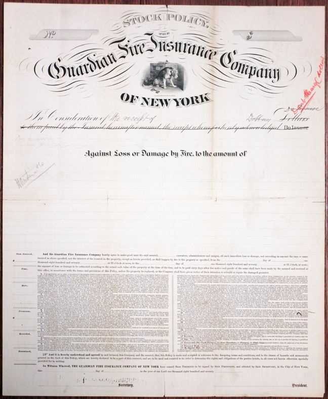 New YorkÉ., ND (ca. 1870s). Proof Certificate for Guardian Life Insurance Co. Stock Policy with archival notes in margins and sections of words crossed out. Fine-VF condition with splits and toning along fold lines. ABNC.