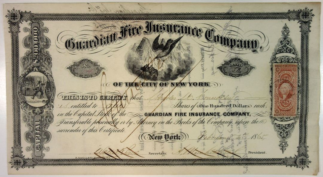 New York, 50 Shares, I/C, Black without underprint, Eagle feeding young with mountains in background, S/N 24, Ink Cancelled, Adhesive 25ct U.S.I.R. stamps on face and back. VF, H. Anstice & Co., Printer. Scarce Insurance Company