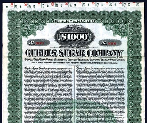 New York, 1913, $1000, 7% 1st Mortgage Specimen Bond, Black on green border and underprint with no vignette, POC's red SPECIMEN overprints and red s/n “00000 “, VF condition, FLBNC.