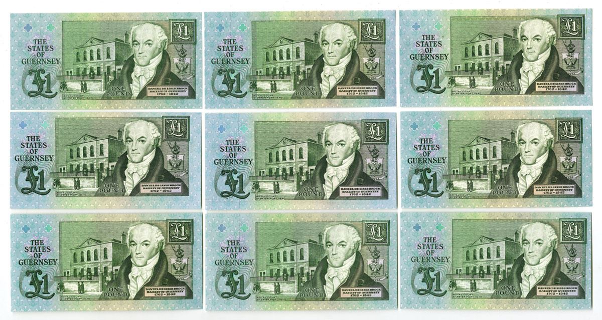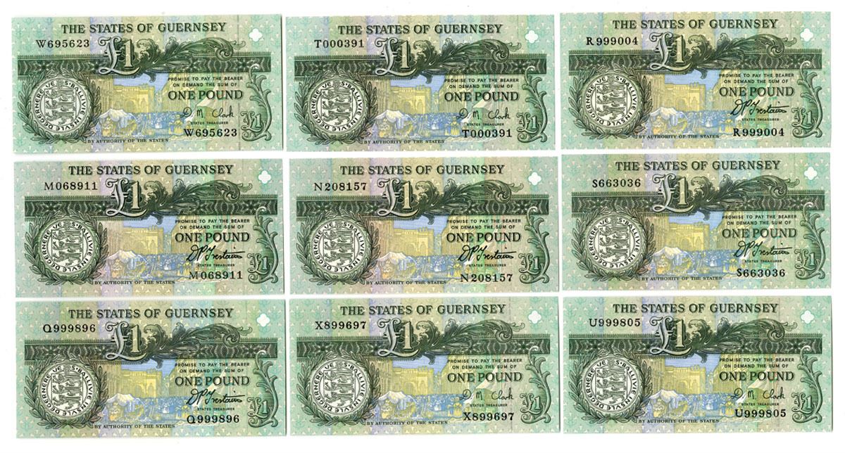 Guernsey, ND (1991). £1, P-52b (5) and P-52c (4), Group of Issued Banknotes, Dark green on m/c underprint with market scene at bottom center, Back is dark green on m/c underprint with Royal Court at center, Uncirculated to Gem Uncirculated or better condition. (9). Sold "AS IS" no returns accepted.