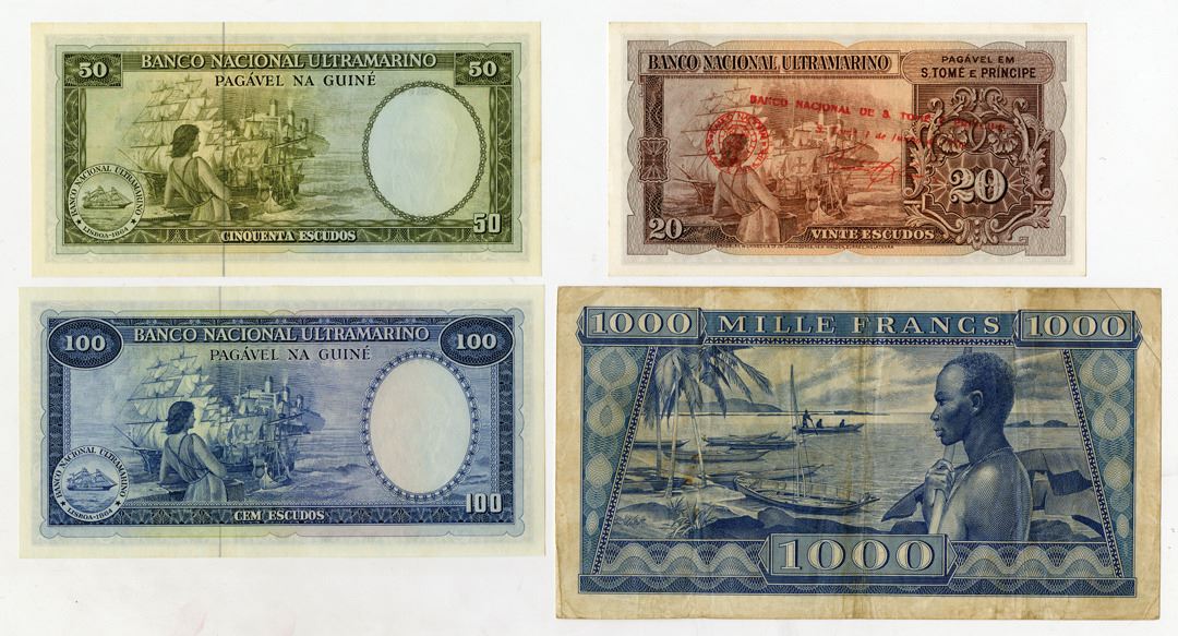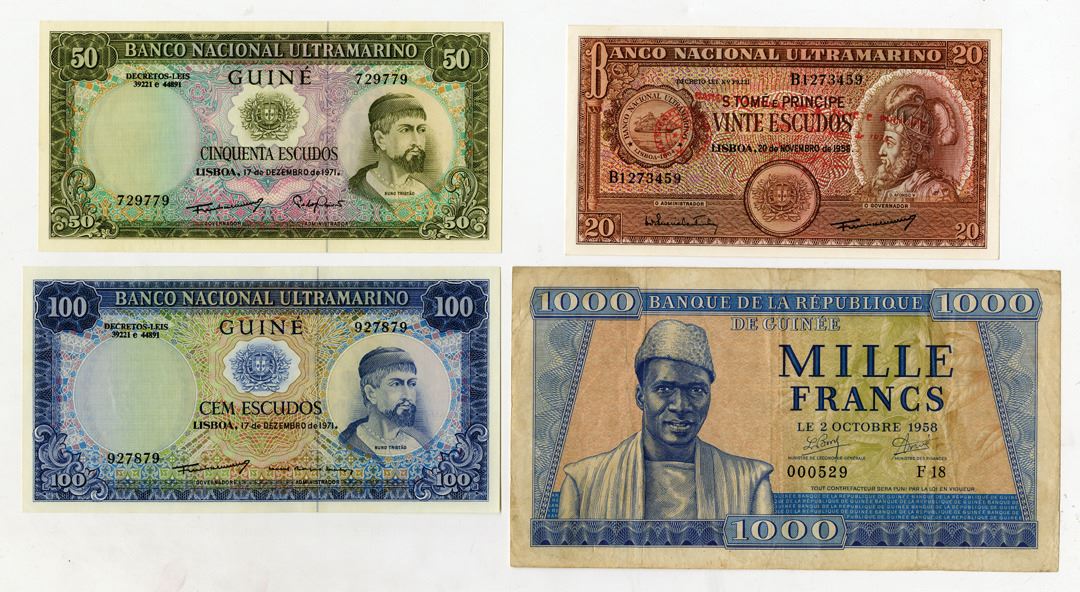Guiana, Portuguese Guinea, & St. Thomas & Prince, 1958-71. Lot of 4 Issued Banknotes, Includes: Banque of the Republic of Guinea 1000 Francs, P-9, 1958; Banco Nacional Ultramarino - Guine 50 Escudos, P-44a, 1971; 100 Escudos, P-45a, 1971; Banco Nacional Ultramarino - S. Tome e Principe 20 Escudos, P-36a, 1958. Notes range from VF-AU condition. (4). Sold "AS IS" no returns accepted.