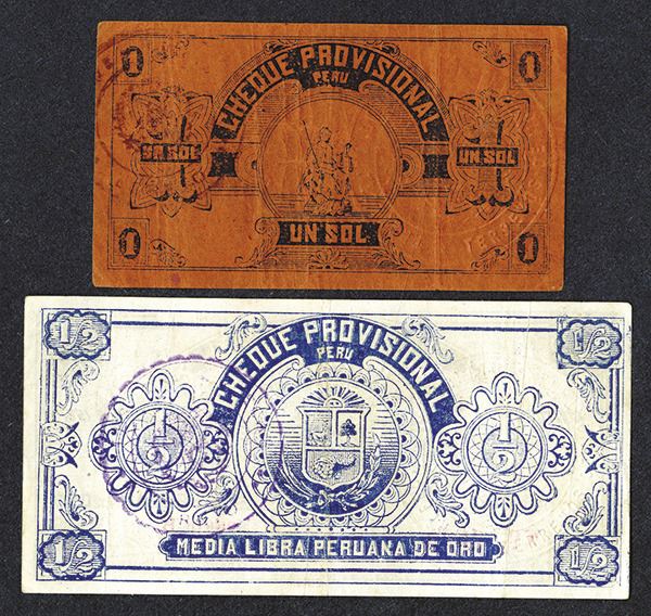 Peru - Revolutionary. 1 Sol, 1/2 Libra. P-S604, S605. Both with hand stamps. VF-XF. 2 pieces.