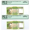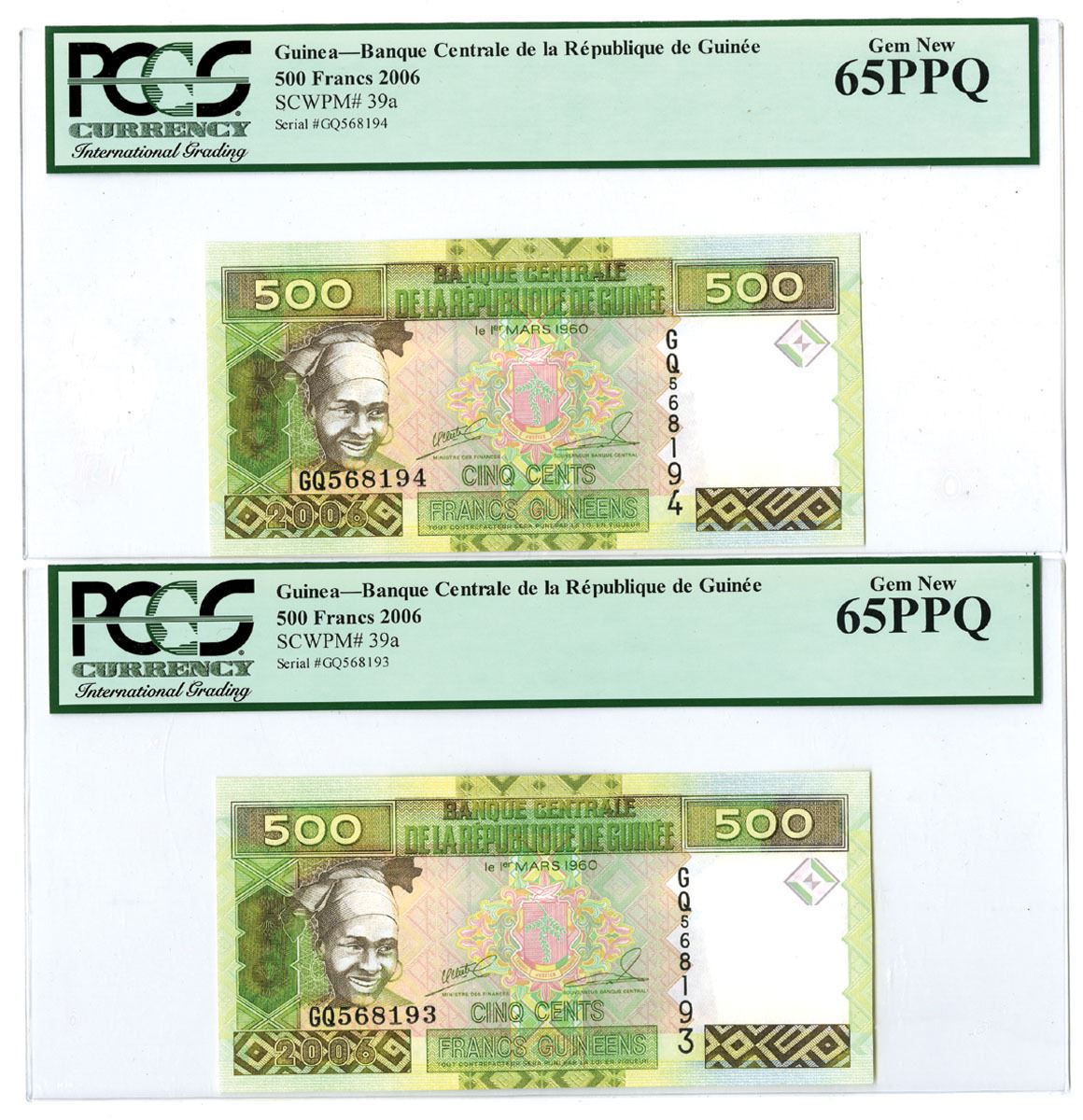 Guinea, 2006. 500 Francs, P-39a (2), Sequential Banknote Pair, Yellow and green on m/c with arms at center and woman at left, Back is m/c with mining operation at center, S/Ns GQ568193 and GQ568194, Both are PCGS graded Gem New 65PPQ. (2). Sold "AS IS" no returns accepted.