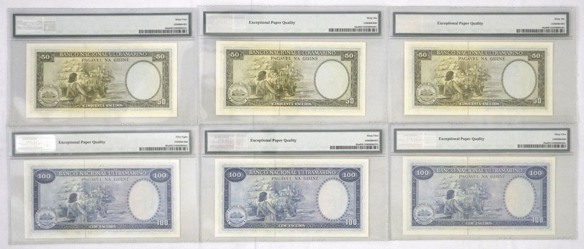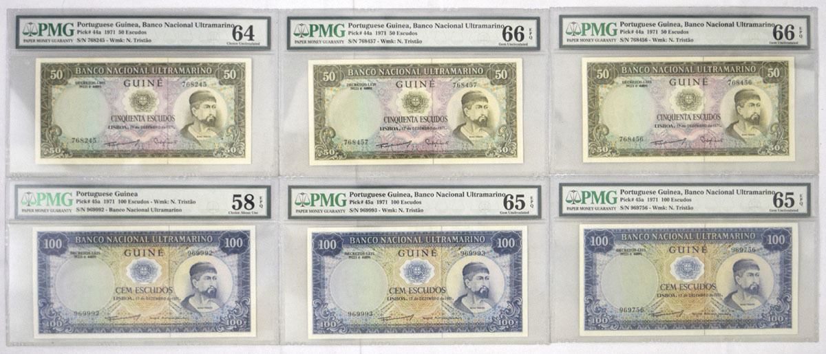 Guinea/Portuguese Administration, 1971. Lot of 6 Issued Banknotes, Includes: 50 Escudos, P-44a (3), S/Ns 768245, 768456, & 768457, Notes are PMG graded Choice Unc 64 and Gem Unc 66 EPQ (2); 100 Escudos, P-45a (3), S/Ns 969756, 969992, & 969993, Notes are PMG graded Choice About Unc 58 EPQ and Gem Unc 65 EPQ (2). BWC. (6). Sold "AS IS" no returns accepted.