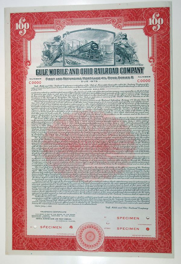 Mississippi. $100 Specimen 4% Series B 1st and Refunding Mortgage Coupon Bond, Black print on red border and under tint, Allegorical figures at top flanking image of fast moving locomotive, Specimen overprints and POC's, VF-XF condition, SBNC.