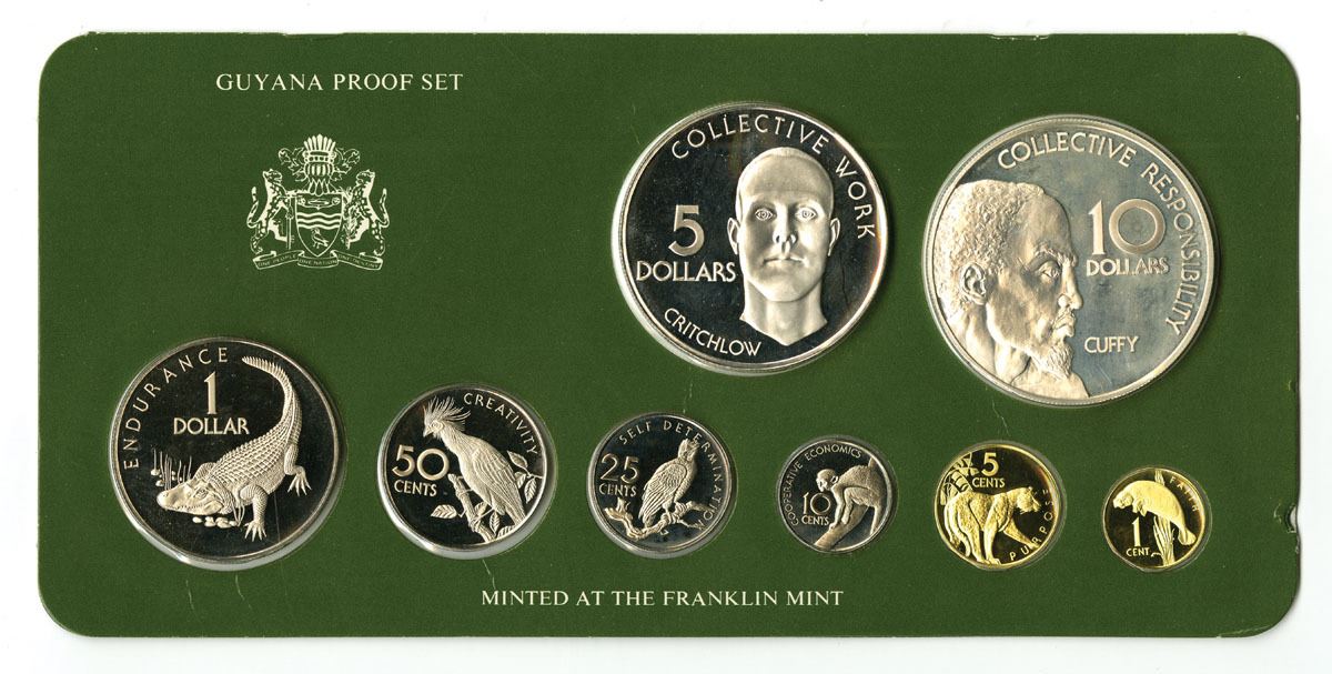 Guyana, 1976. Eight Coin Proof Set in Original Packaging, Includes 2 Silver Coins: 10 Dollar Coin - minted of 92.5% Sterling Silver; 5 Dollar Coin - minted of 50% Silver. Lot also includes 1 Dollar, 50 Cents, 25 Cents, 10 Cents, 5 Cents, and 1 Cent. Lot includes Certificate of Authenticity. All are in Gem to Superb Gem proof condition. (There is 1.87 ounces of .999 silver.)