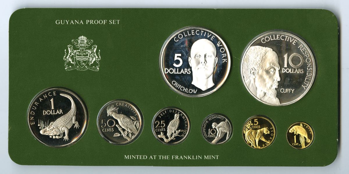 Guyana, 1977. Proof Set of 8 Coins issued by Franklin Mint in Original Packaging with Certificate of Authenticity, 5 Dollar Coin is .500 Silver and 10 Dollar Coin is .999 Silver totaling 1.87 ounces of silver. Packaging is in XF to AU condition and Coins are UNC.