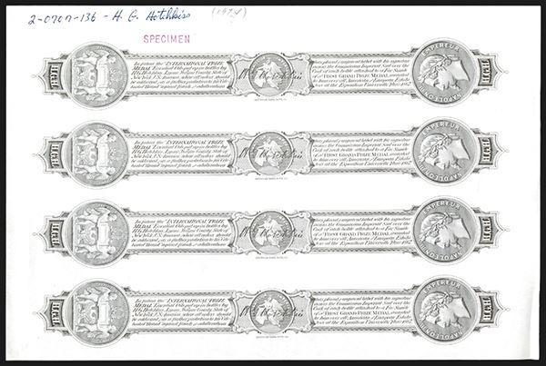 H.G.H. (H.G. Hotchkiss) Tax label proof sheet. 4 designs on page. Marked Specimen. Litho. With 1974 notation. Extremely Fine.