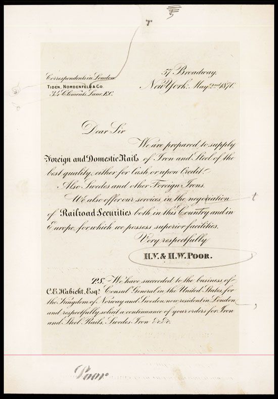 New York, 1870, Engraved proof printed on india paper mounted on large card from H.V. & H.W, Poor soliciting business in supply Òforeign and domestic rails of iron and steelÓ, Railroad Securities, etc. in New York or through their agent in London, Additionally, they mention they have taken over the companies of the Consul General in the U.S. for Norway and Sweden, Some proof reading corrections on the letter and also includes the original hand-written letter, Three horizontal folds, Fine condition. ABNC.