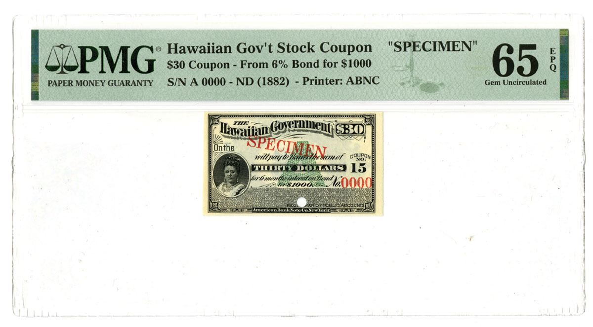 Hawaii Government, ND (1882). $30 Specimen 6% Bond Coupon for $1000 Bond, Black on green underprint with portrait of woman at bottom left, S/N A 0000, Coupon No. 5, Specimen overprint and POCs, PMG graded Gem Unc 65 EPQ, ABNC.