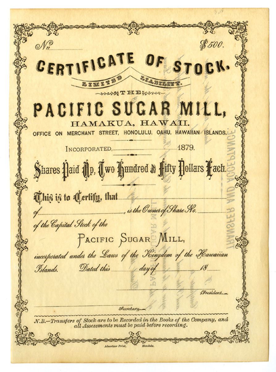 Hamakua, Kingdom of Hawaii, (Inc. in 1879), ND (ca.1880s). Pacific Sugar Mill, U/U Capital Stock Certificate, Vertical format, Black print with simple black scroll work border, Company title at top center, AU to Uncirculated condition. Adviser Print, Honolulu