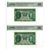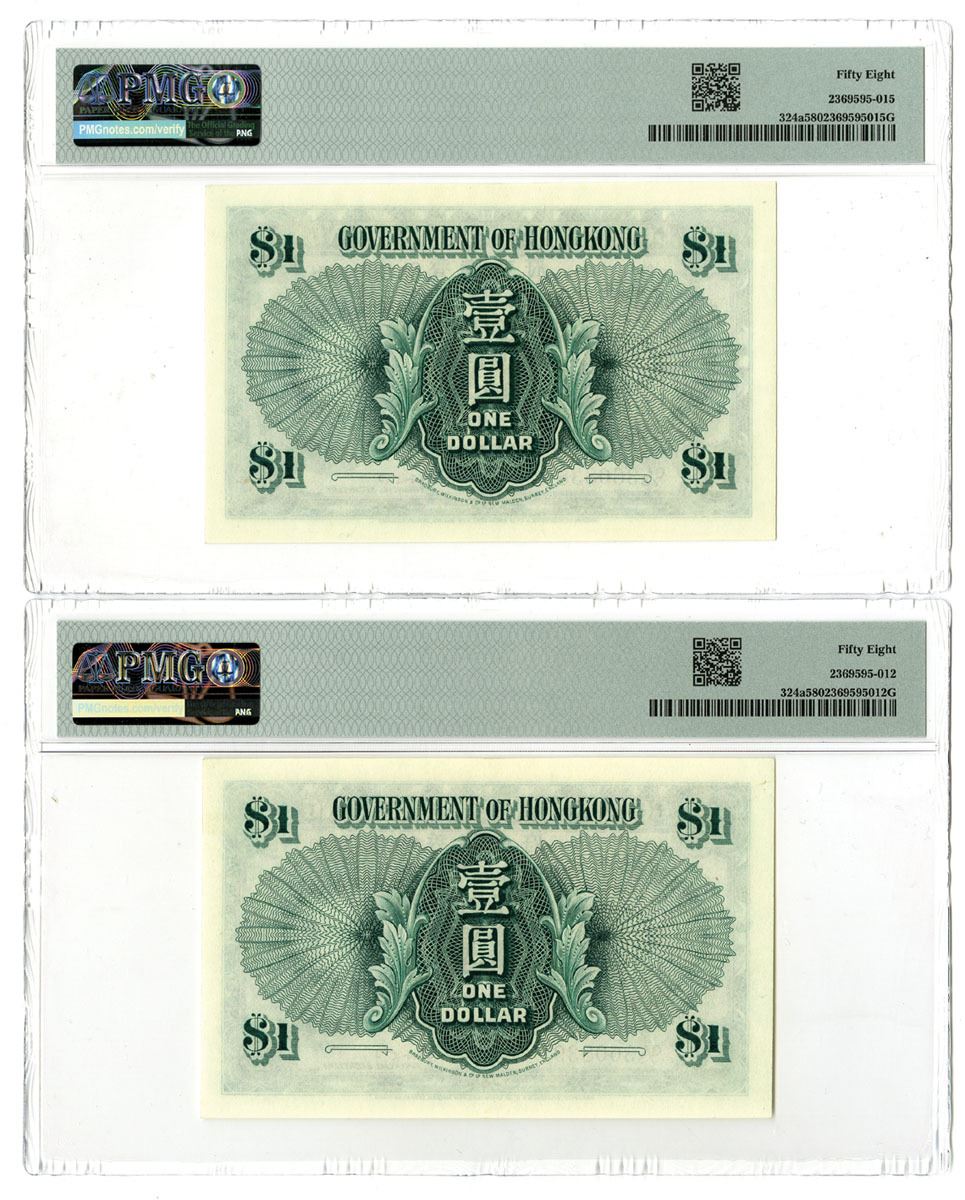Hong Kong. 9th April, 1949, $1, P-324a, Issued sequential pair of banknotes, Greene on m/c underprint, King George VI on right, back green, S/Ns G/3 360836 - 360837, Both are PMG graded Choice About Unc. 58, attractive pair of notes, both giving the appearance of Choice to Gem Uncirculated. Another superior example for the grade.