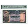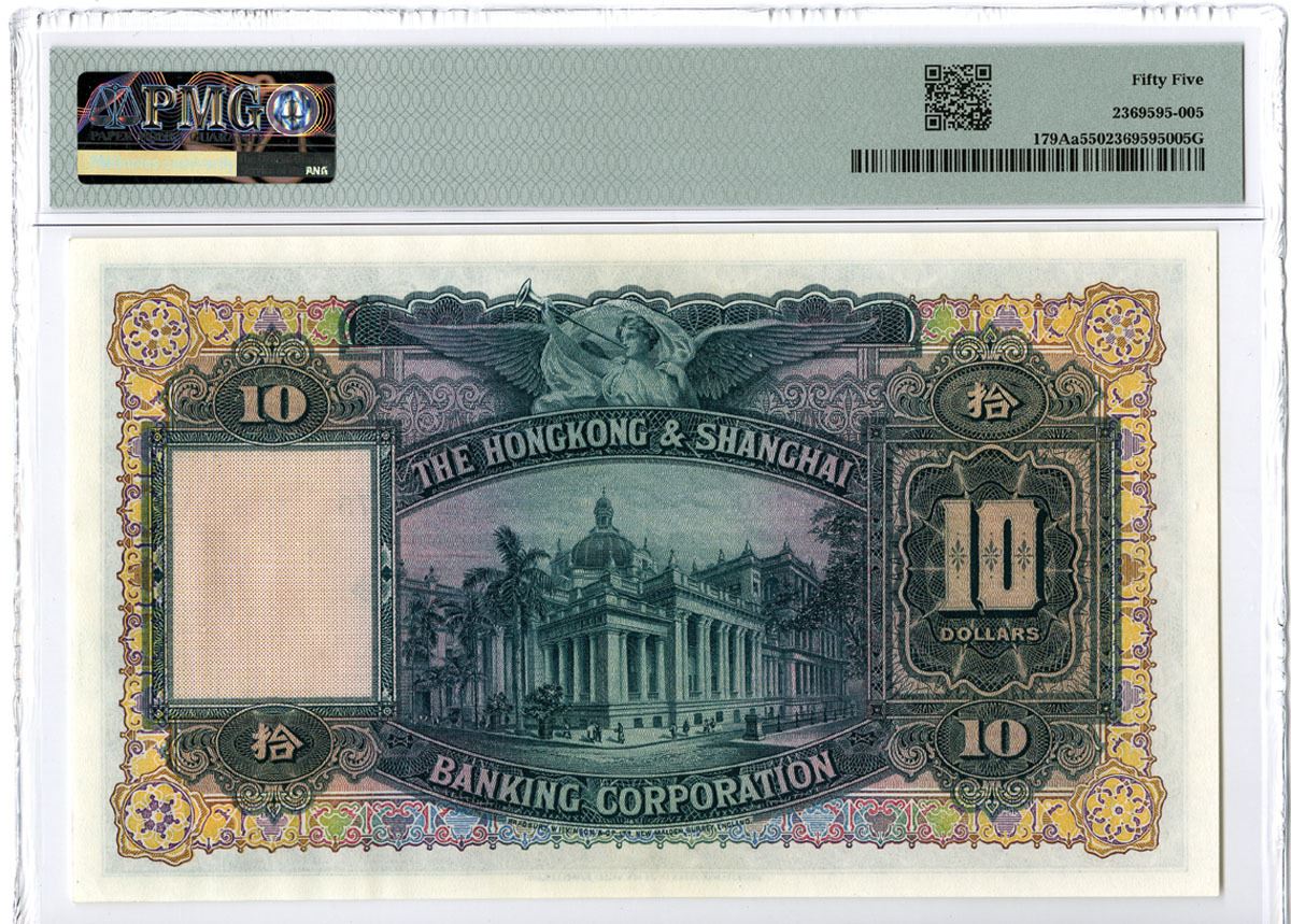 Hong Kong. 31st March, 1953. $10, P-179 Aa, KNB63e-f, Issued banknote, Green vignette and text on pink and m/c underprint, allegorical reaper at left, arms in middle, back green and m/c with bank building in middle, S/N V/H 330,475, PMG graded About Uncirculated 55, a lovely note with 4 large even margins, sharp corners and bright colors and appears uncirculated. BW&C.