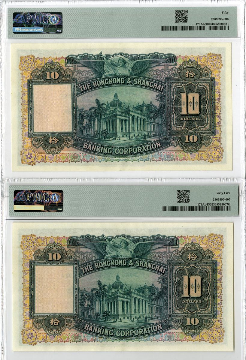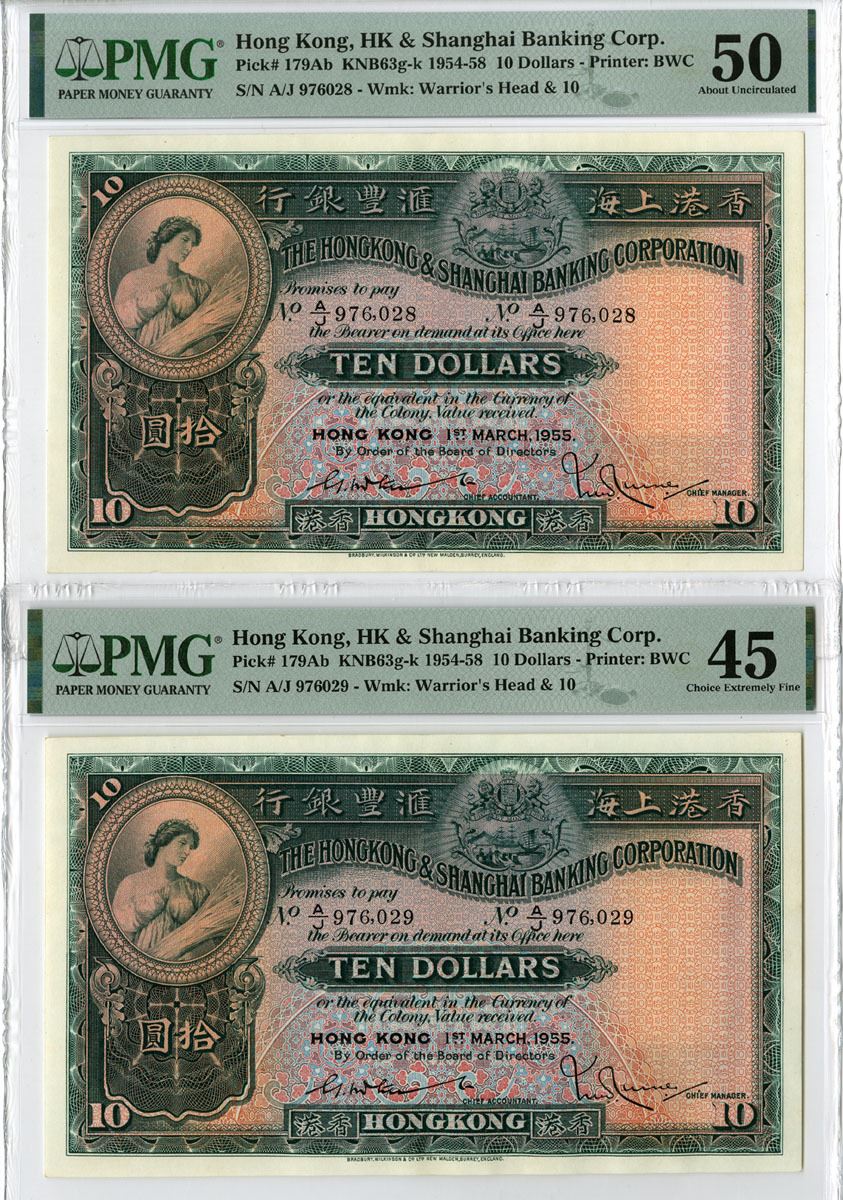Hong Kong. Lot of 2 notes, Both are 1st March, 1955. $10, P-179Ab KNB63g-k, Issued banknote, Green vignettes and text on pink and m/c underprint, allegorical reaper at left, arms in middle, back green and m/c with bank building in middle, S/Ns A/J 976028 and 976,029, Both notes are PMG graded About Uncirculated 55, and Choice Extremely Fine 45 respectively, another very attractive pair of notes that have 4 large even margins, sharp corners and bright colors and appear uncirculated. BW&C. (2)