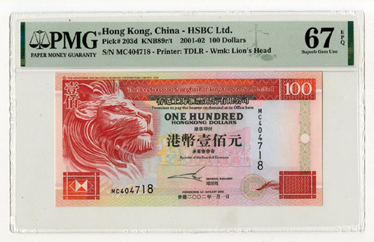 Hong Kong, 2002. 100 Dollars, P-203d KNB89r/t, Issued Banknote, Red on m/c underprint with stone lion at left, S/N MC404718, PMG graded Superb Gem Unc 67 EPQ, TDLR.
