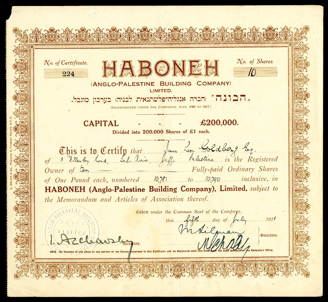 Palestine, 10 Issued Shares, July 5, 1921, VF+, Corner tear, Split top center about 1 1/2"