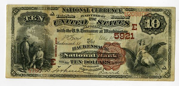 Hackensack, NJ. $10, S/N 4780 - U208806U, This bank was in existence for about 20 years. According to the census, there are 16 notes known on the bank. This note is only the second 1882 Brown Back note known, and the first $10 Brownback to surface. Choice Fine to VF with large even margins, bright colors and relatively firm paper with sharp corners. There are 3 small pin holes on the right border and 2 small pin holes on the left border. Rare and attractive note.