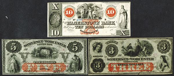 MD. Cherubs making wine; Farm girl and blacksmith; Cattle. First an unsigned remainder. Others redated to 1864 with low serial #s. All Uncirculated. 3 pieces.