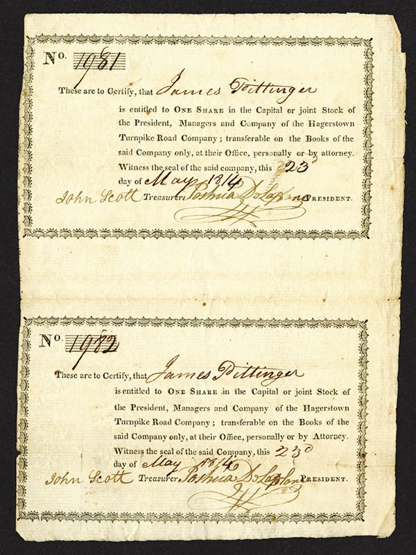 Pennsylvania. Two consecutive One Share Stock Certificates, vertical uncut pair. Scarce thus. Bold letterpress embossing, fold between certificates, and once within.