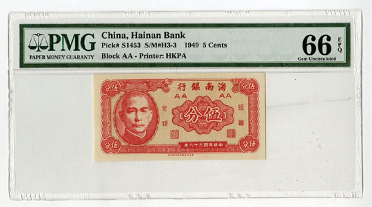 China, 1949. 5 Cents, P-S1453 S/M#H3-3, Issued Banknote, Red on tan underprint with SYS at left, Uniface note, Black AA, PMG graded Gem Uncirculated 66 EPQ, HKPA.