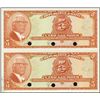 Convention Du 13 Avril 1919. (ca.1960-70). P-200 Unlisted. 1 Gourde; P-202 Unlisted. 5 Gourdes. Uncut vertical specimen pairs. Red specimen overprints and POC's. Both have horizontal folds between notes, otherwise the 1 Gourde note appears almost choice uncirculated and the 5 Gourdes appears uncirculated with smudged black ink on face and back in a couple areas. Rare as uncut pairs. ABNC