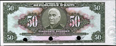 1979. P-235As. 50 Gourdes Tyvek banknote. No serial numbers. Light red specimen overprint and punched out cancels. Wmk paper. AU+ to Unc. Rare Tyvek item. ABNC.