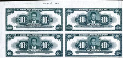 1984 ND Issue. P-242 Unlisted. 10 Gourdes Proof top left corner face block of 4 on white planchetted banknote paper with plate numbers and archival notations engraved or printed on top margin. Dark green. Vignette of Jean-Claude Duvalier. Unlisted as proof in Pick. Left 2 notes are Choice Unc., and the right 2 notes have light fold on the right margin where sheet was folded for storage. Rare proof. ABNC.
