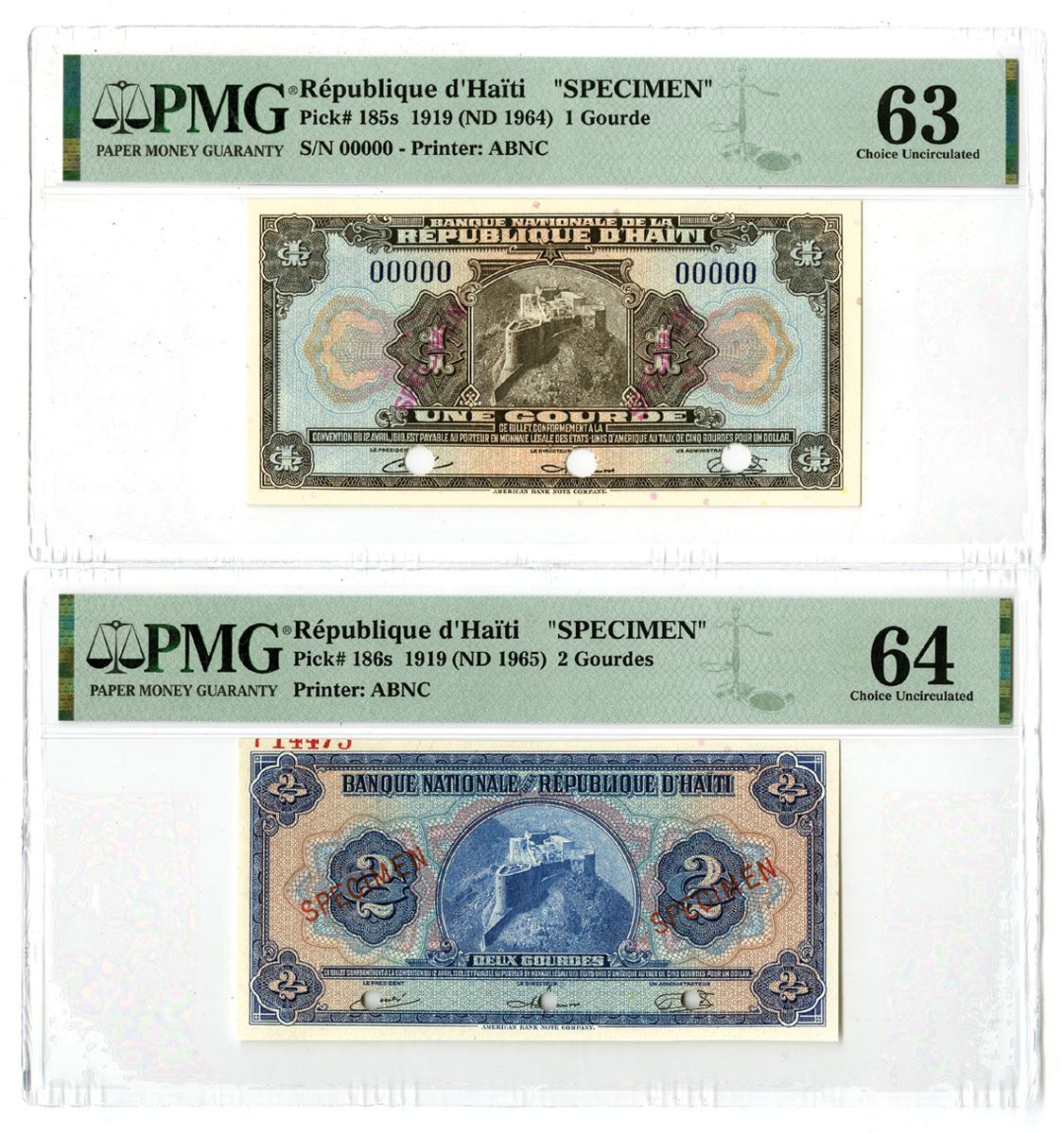 Haiti, 1919 (1644-65). Lot of 2 Specimen Banknotes, Includes: 1 Gourde, P-185s, S/N 00000, PMG graded Choice Uncirculated 63; 2 Gourdes, P-186s, No S/N, PMG graded Choice Uncirculated 64. Both notes have Specimen overprints and POCs. ABNC. (2). Sold "AS IS" no returns accepted.