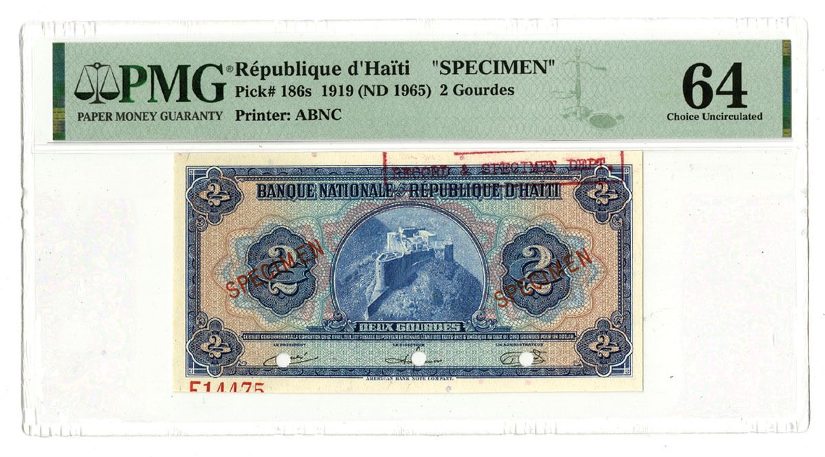 Haiti, 1919 (1965). 2 Gourdes, P-186s, Specimen Banknote, Blue on m/c with Citadel rampart at center, Back is dark blue with arms at center, S/N 00000, Specimen overprints and POCs, PMG graded Choice Uncirculated 64 with comment "Printer's Stamp," ABNC.