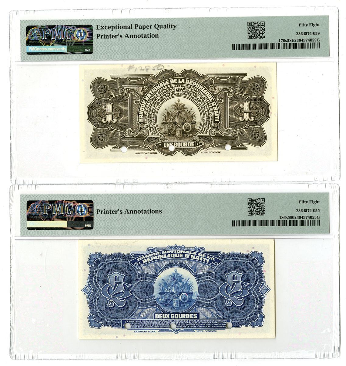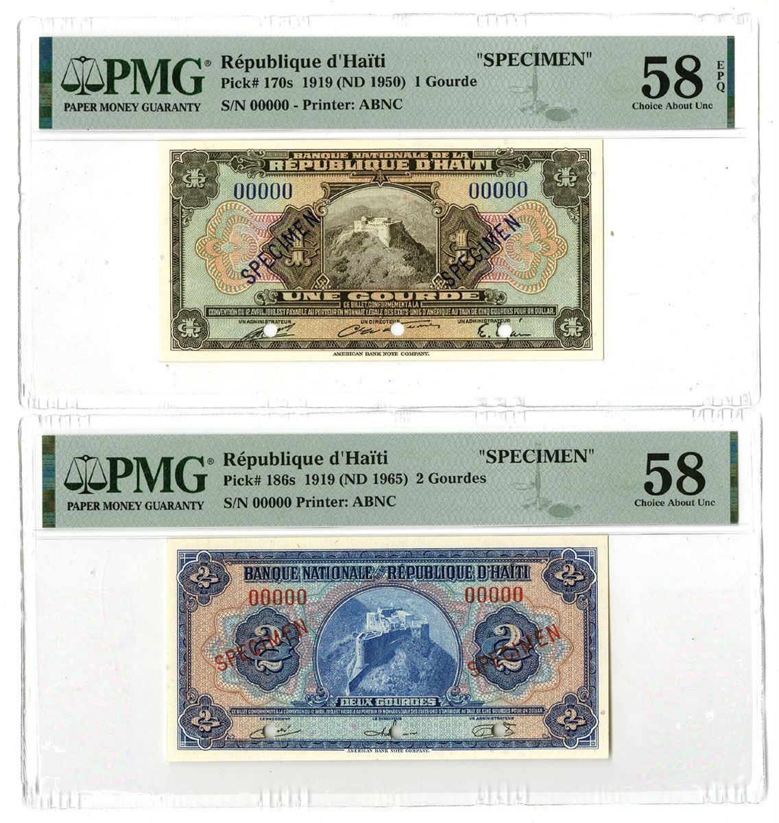 Haiti, 1950 & 1965. Lot of 2 Specimen Banknotes, Includes: 1919 (ND 1950) 1 Gourde, P-170s, S/N 00000, PMG graded Choice About Unc 58 EPQ with comment "Printer's Annotation"; 1919 (ND 1965) 2 Gourdes, P-186s, S/N 00000, PMG graded Choice About Unc 58 with comment "Printer's Annotations." Both notes have Specimen overprints, POCs, and are printed by ABNC. (2). Sold "AS IS" no returns accepted.