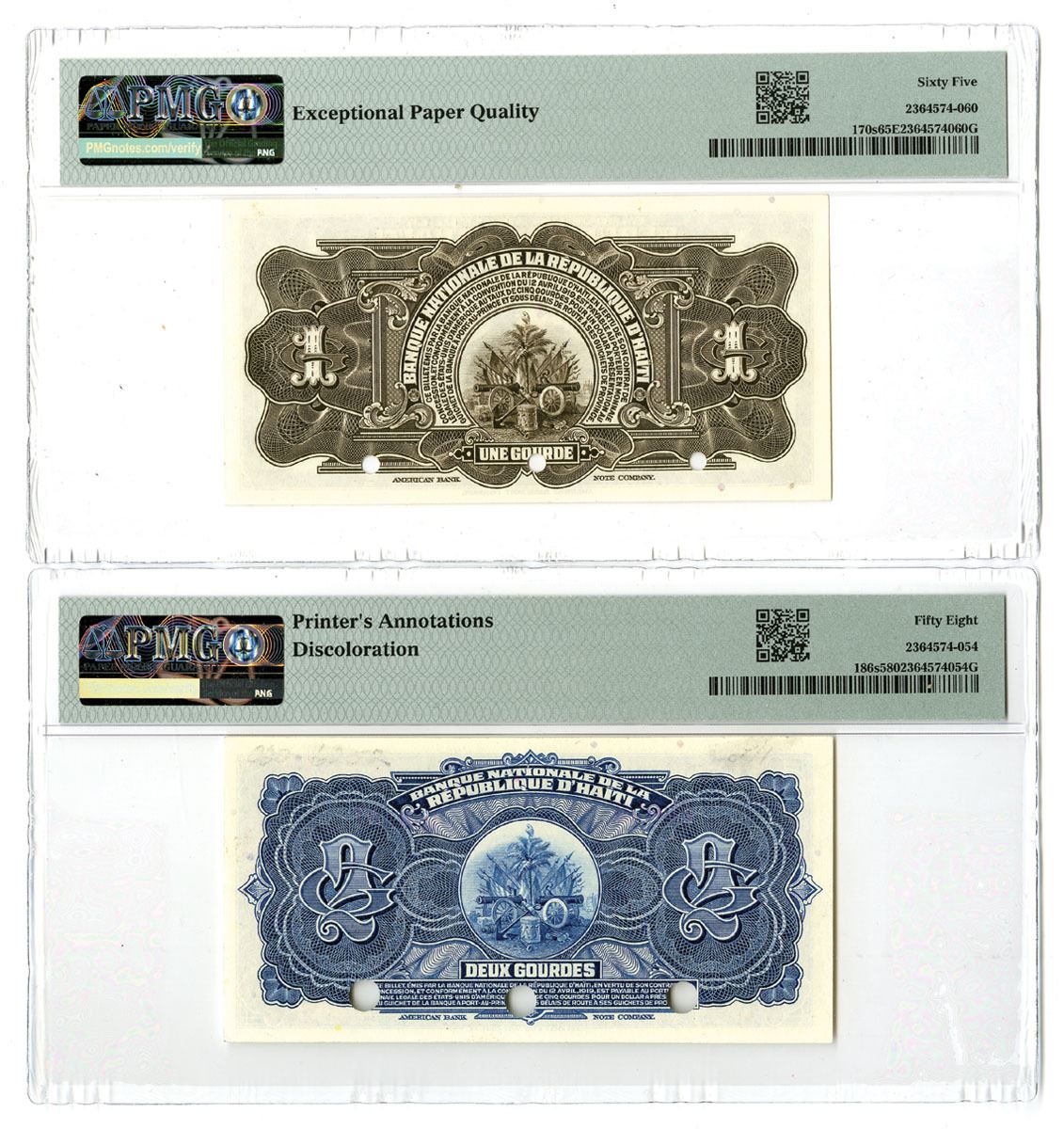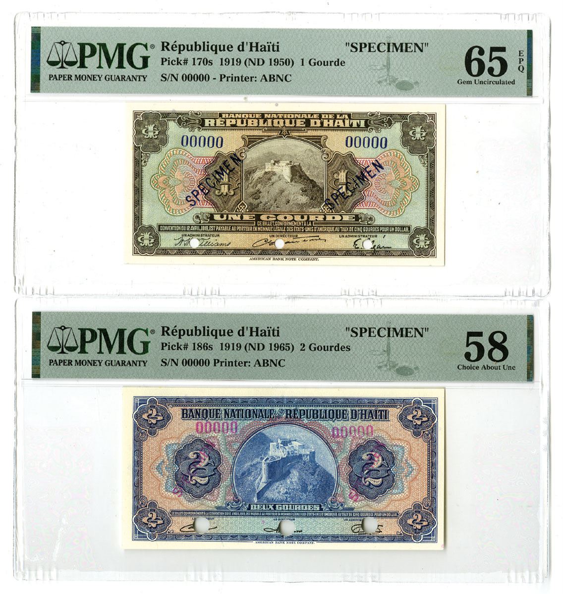 Haiti, 1950 & 1965. Lot of 2 Specimen Banknotes, Includes: 1919 (ND 1950) 1 Gourde, P-170s, S/N 00000, PMG graded Gem Unc 65 EPQ; 1919 (ND 1965) 2 Gourdes, P-186s, S/N 00000, PMG graded Choice About Unc 58 with comment "Printer's Annotations and Discoloration." Both notes have Specimen overprints, POCs, and are printed by ABNC. (2). Sold "AS IS" no returns accepted.