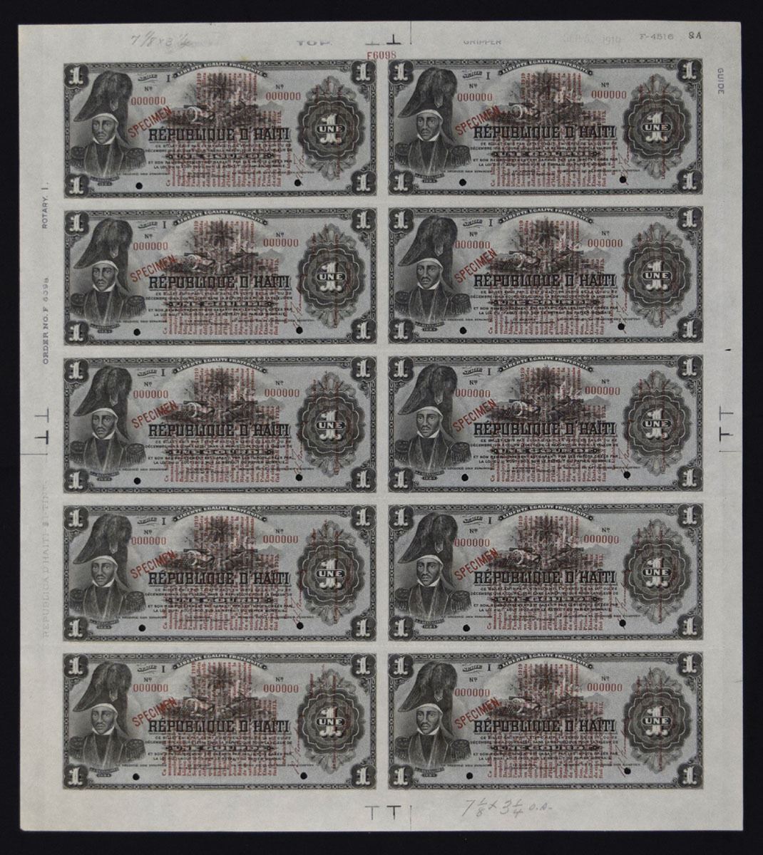 Haiti, L.1919. 1 Gourde, P-140s, Series "I", Uncut Sheet of 10 Banknotes, Black on blue underprint with portrait of J.J. Dessalines at left and arms at center with red text overprint, Back is m/c with farming scene at center, Note is overprint of P-131, Measures 7 1/8 x 3 1/4, Red specimen and "000000" Serial Number overprints, each note has 2 punched out cancels in the signature block areas, the sheet has been rouletted horizontally between the notes but is imperforate vertically. Uncirculated to CU condition or better with archival notations at bottom. ABNC.