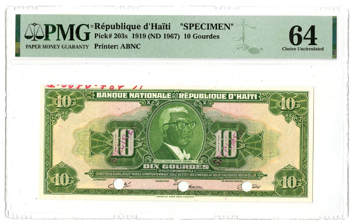 Haiti, 1919 (ND 1967). 10 Gourdes, P-203s, Specimen Banknote, Green on pink underprint with portrait of Duvalier at center, Back is dark green with arms at center, S/N 00000, Specimen overprints and POCs, PMG graded Choice Uncirculated 64 with comment "Printer's Annotation," ABNC.