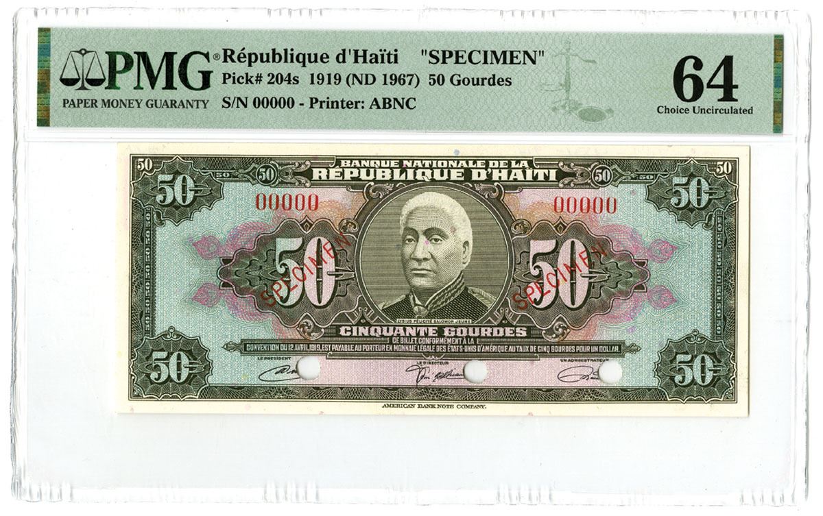 Haiti, 1919 (ND 1967). 50 Gourdes, P-204s, Specimen Banknote, Black on m/c underprint with portrait of Jeune at center, Back is black with arms at center, S/N 00000, PMG graded Choice Uncirculated 66 with comment "Printer's Stamp & Annotations," ABNC.