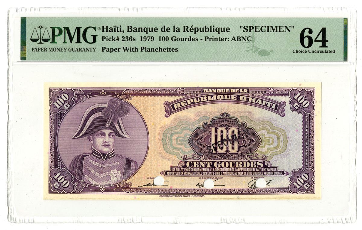 Haiti, 1979. 100 Gourdes, P-236s, Specimen Banknote, Purple on m/c underprint with Portrait of Henri Christophe (President and later King) at left, Back is purple with arms at center, No S/N, Specimen overprint and POCs along bottom, PMG graded Choice Uncirculated 64, ABNC.