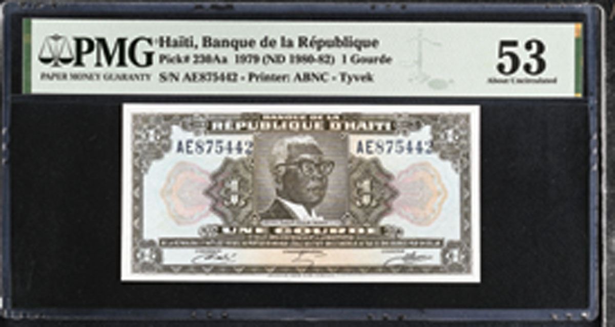 Haiti, L.1979 (ND 1980-82). 1 Gourde, P-230Aa, Issued Tyvek Polymer Banknote, Dark brown on m/c underprint with Portrait of President Dr. Francois Duvalier at center, Printed on Tyvek paper, S/N AE875442, PMG graded About Uncirculated 53.