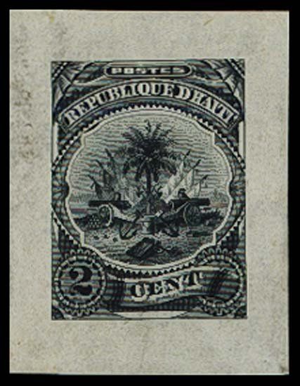 2 Cent, circa 1870-80's. Scott Unlisted Cut down LDP on india paper in black. Arms of Haiti with ornate borders. Unique in archive. No printers imprint but either ABNC, CBNC or NBNC product. The paper is slightly wavy, but overall in XF to AU condition. Some glue remnants on back. Rare proof.