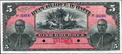 1908. P-125s. 5 Gourdes; No Ser. Specimen. Red specimen overprint, POC and blue "00000" serial numbers. Duplicate portraits of Alexis on left and right. Includes matching proof vignette of Alexis. Choice Unc. condition. Rare note. ABNC.