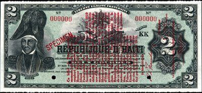 1919. P-140s; 141s. 1 Gourde, Series H; 2 Gourdes, Ser. KK 2 different Specimens. Both with Red specimen overprints, POC's and blue "00000" serial numbers. Portraits of Dessalines on left. The 1 Gourde has large margins on the top and right. It is dated on the top margin "Feb 11 1919". The 1 Gourde has one pin hole on the upper left corner and the note would grade AU+. The 2 Gourdes note would grade in Choice Unc. condition. ABNC.