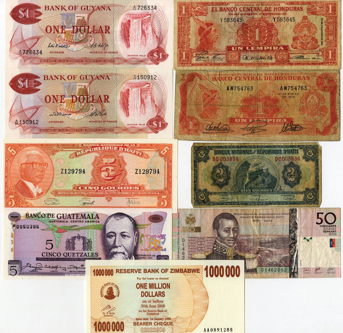 Lot of 9 Banknotes from Haiti, Zimbabwe, Guatemala, Guyana and more. Notes range from Fine to AU condition. (9).