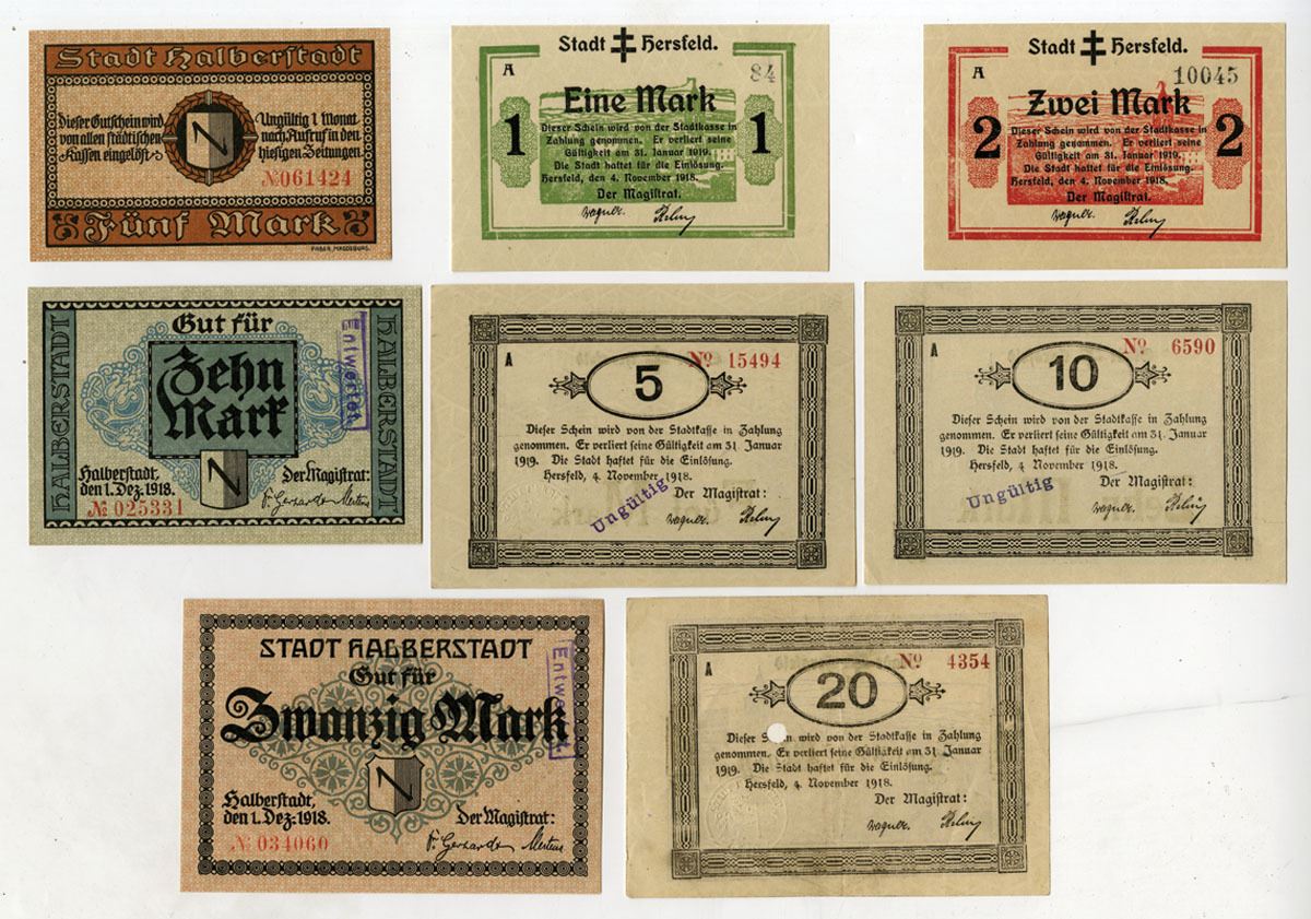 Germany, 1918. Lot of 8 Issued and Cancelled Notgeld, Includes: Stadt Halberstadt 5 Mark, 10 Mark, and 20 Mark Notes with "Entwertet" stamped at margins, 1918; Stadt Hersfeld 1 Mark, 2 Mark, 5 Mark, 10 Mark, and 20 Mark - 5 & 10 Mark have "Ungultig" stamps and 20 Mark has POC, 1918. Notes range from VF to AU condition. (8). Sold "AS IS" no returns accepted.